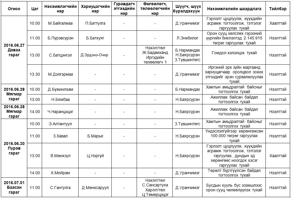 Шүүх хуралдаанаар хэлэлцэх иргэний хэргүүд (2016.06.27-07.01)