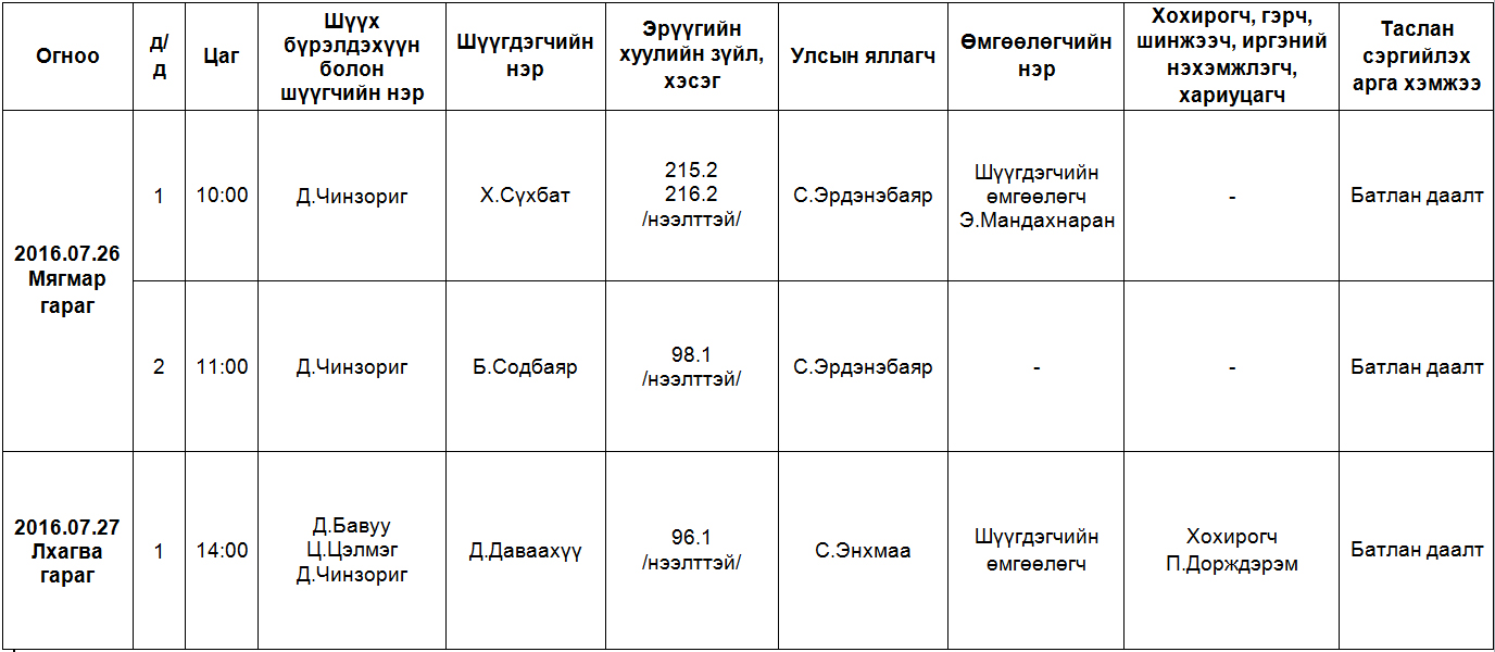 АНХАН ШАТНЫ ШҮҮХ ХУРАЛДААНААР ХЭЛЭЛЦҮҮЛЭХ ЭРҮҮГИЙН ХЭРГҮҮД (2016.07.25-07.29)