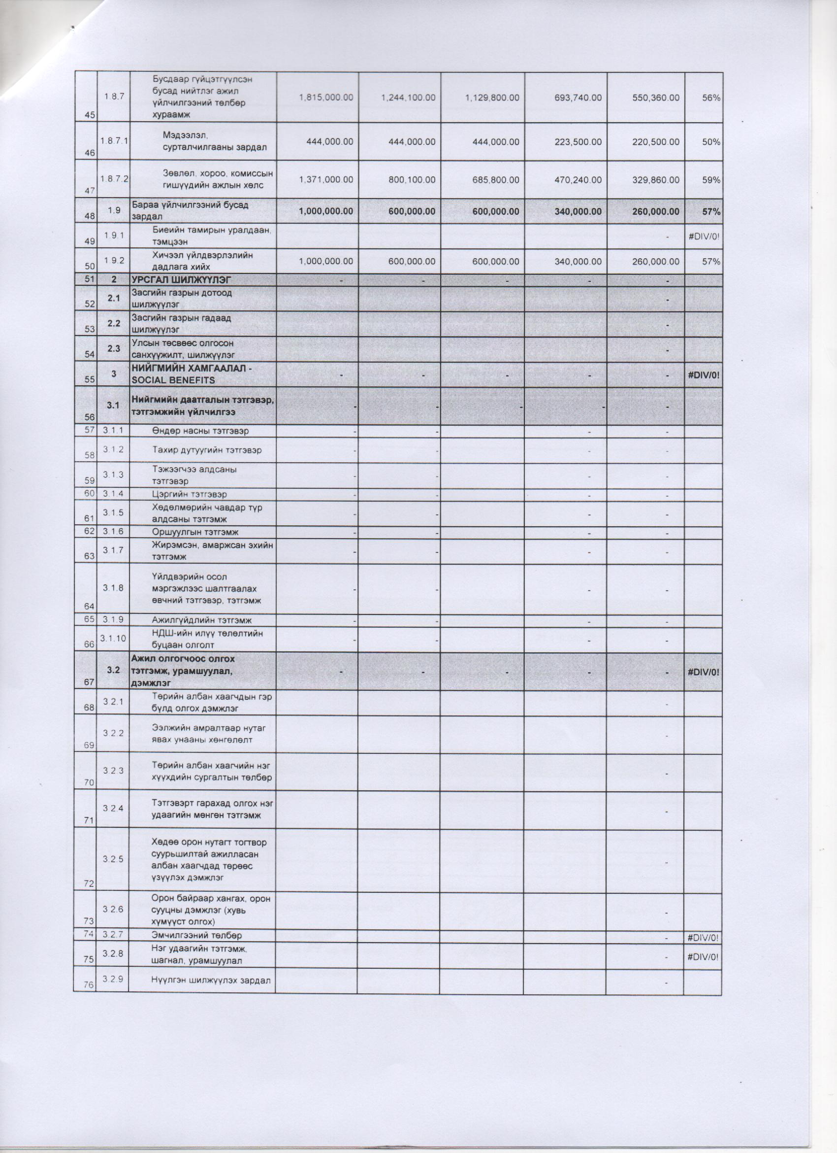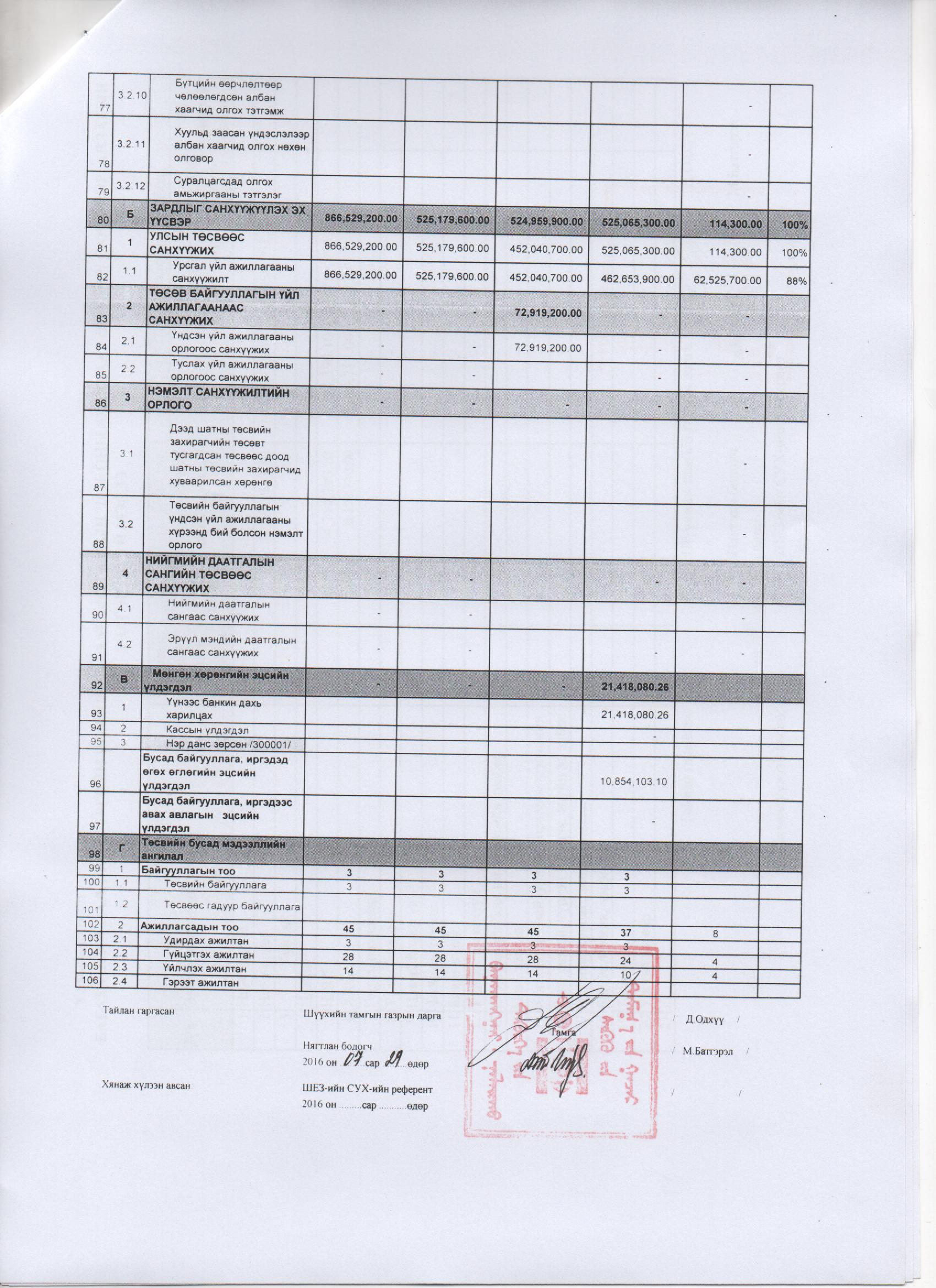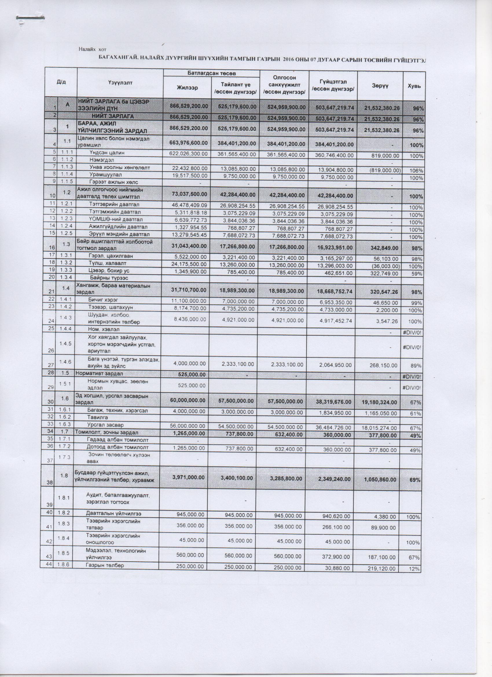 2016 оны 7 дугаар сарын төсвийн гүйцэтгэл