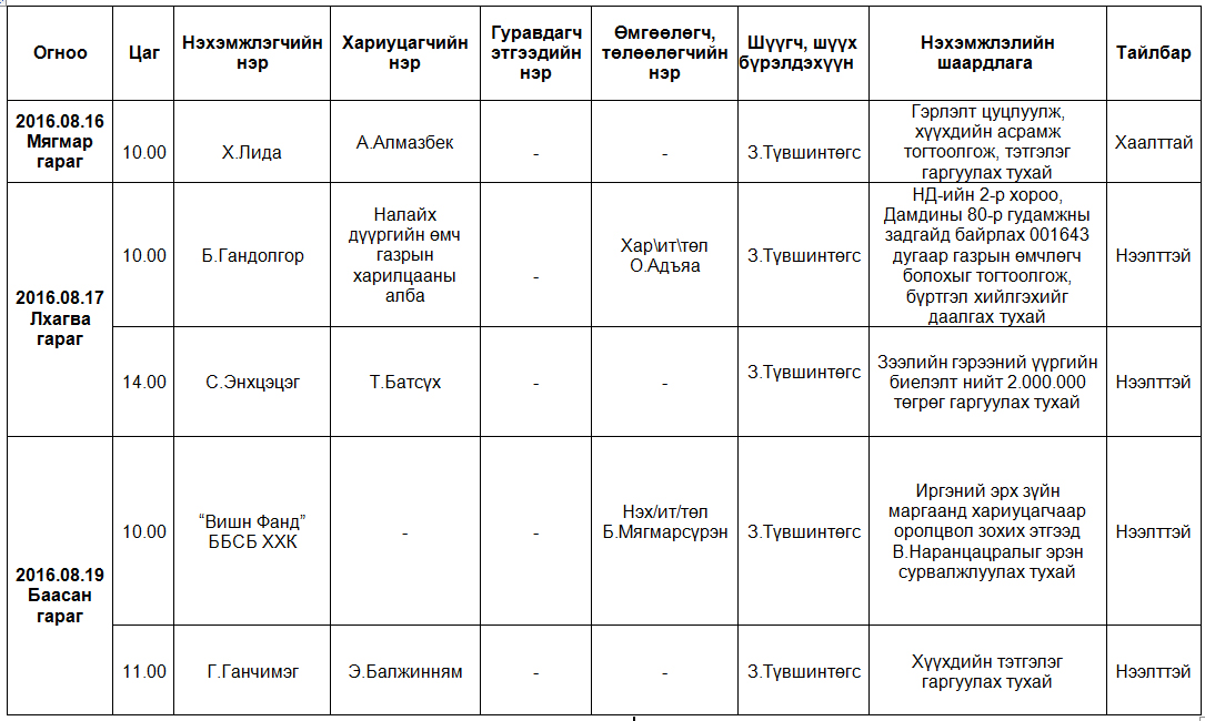 Шүүх хуралдаанаар хэлэлцэх иргэний хэргүүд (2016.08.15-08.19)