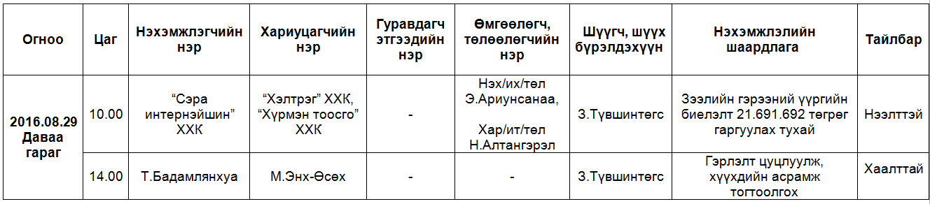 Шүүх хуралдаанаар хэлэлцэх иргэний хэргүүд (2016.08.29-09.02)