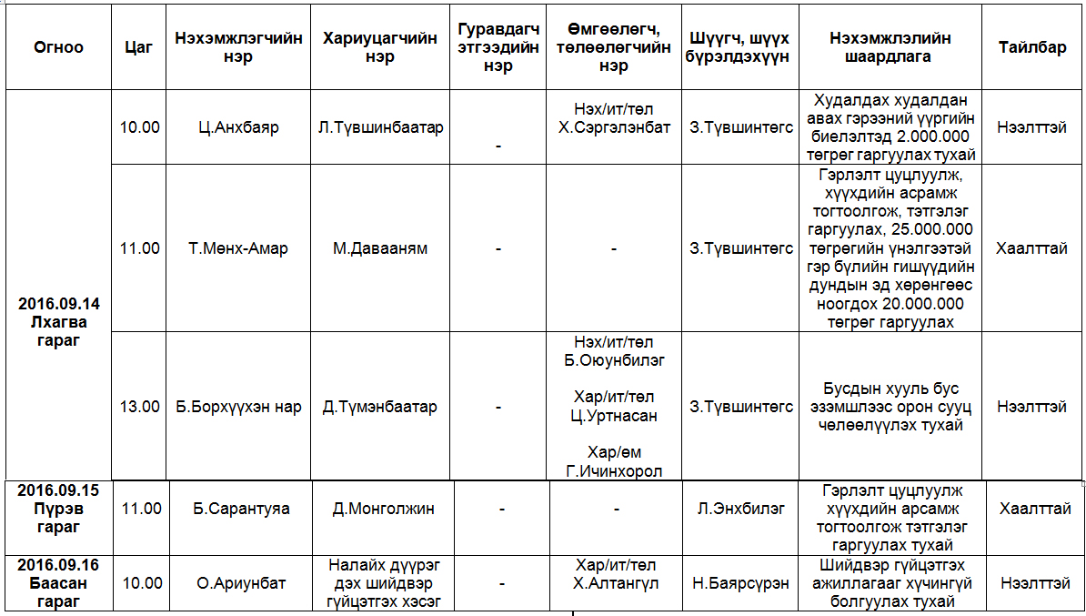 Шүүх хуралдаанаар хэлэлцэх иргэний хэргүүд (2016.09.12-09.16)