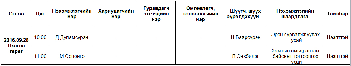 Шүүх хуралдаанаар хэлэлцэх иргэний хэргүүд (2016.09.26-09.30)