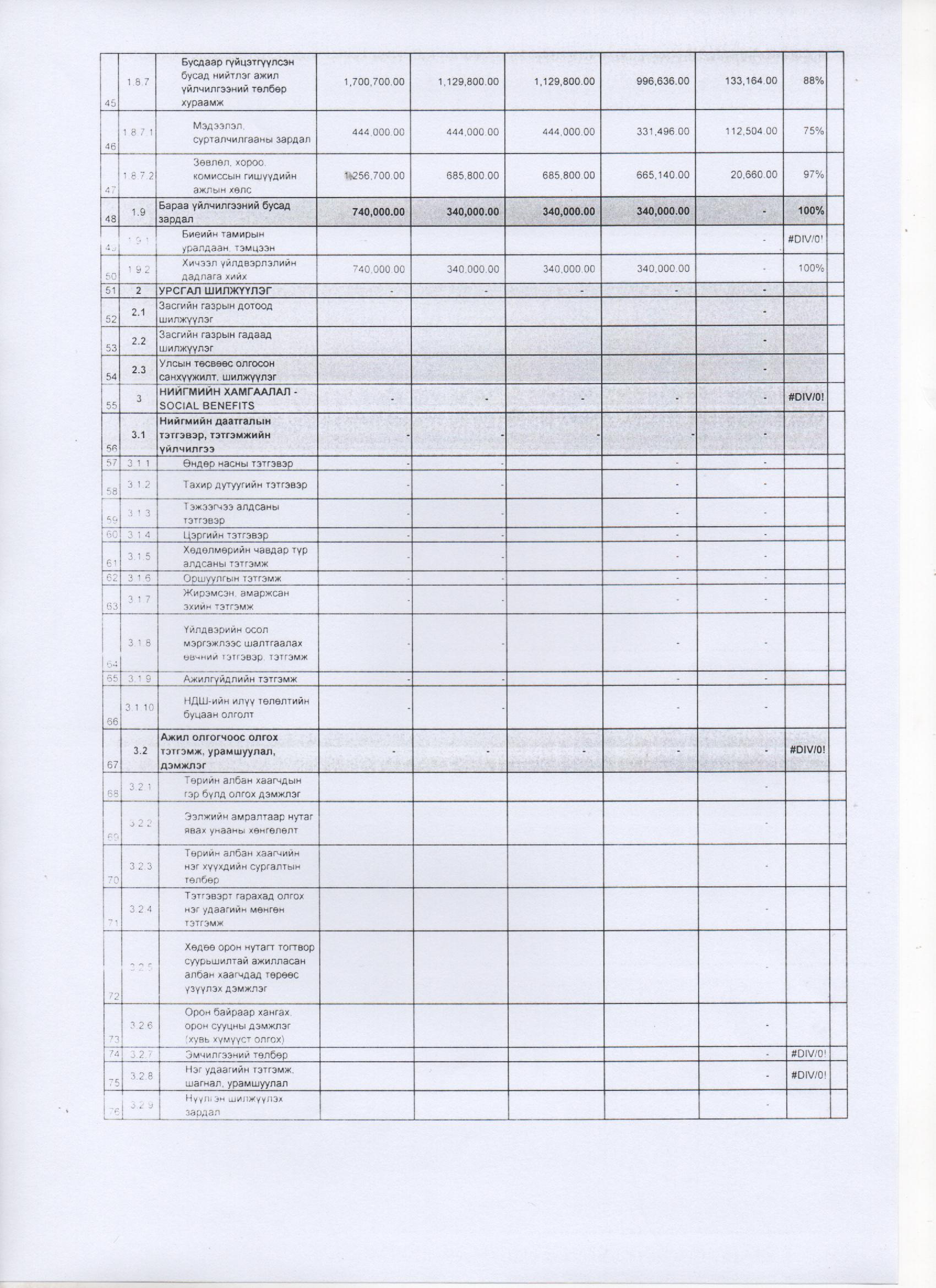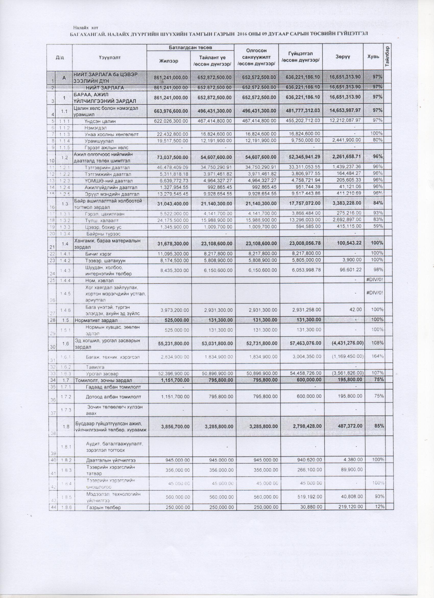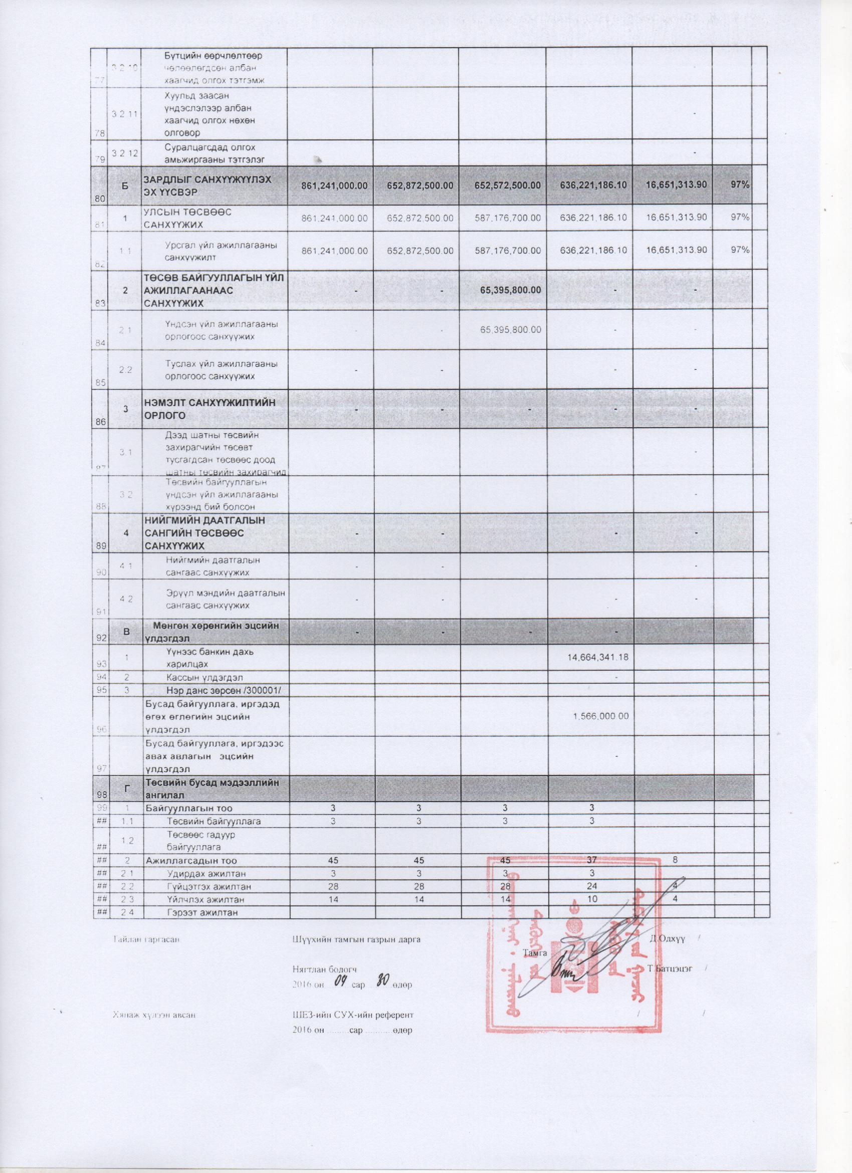 2016 оны 9 дүгээр сарын төсвийн гүйцэтгэл