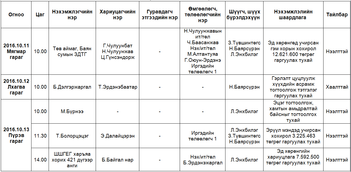 Шүүх хуралдаанаар хэлэлцэх иргэний хэргүүд (2016.10.10-10.14)