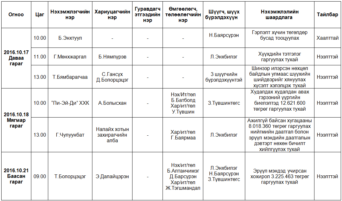 Шүүх хуралдаанаар хэлэлцэх иргэний хэргүүд (2016.10.17-10.21)