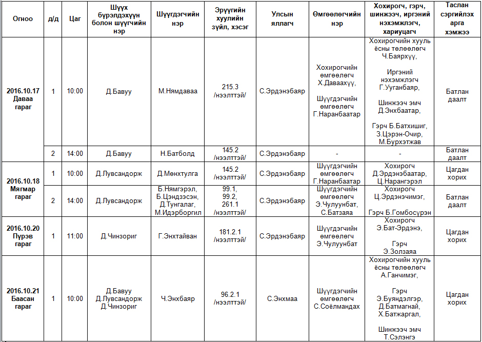 АНХАН ШАТНЫ ШҮҮХ ХУРАЛДААНААР ХЭЛЭЛЦҮҮЛЭХ ЭРҮҮГИЙН ХЭРГҮҮД (2016.10.17-10.21)