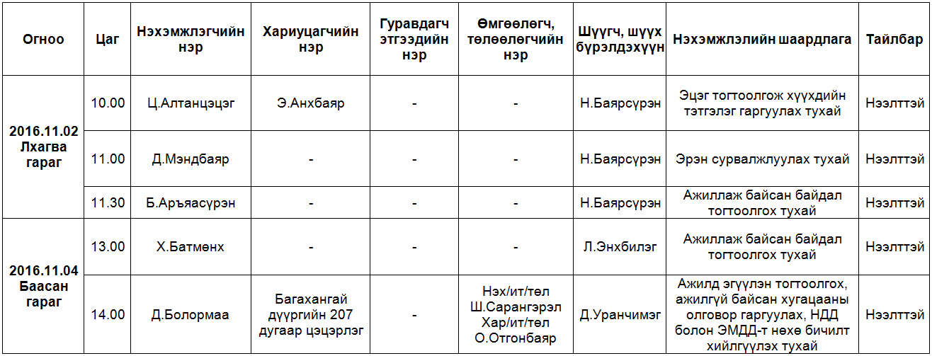 Шүүх хуралдаанаар хэлэлцэх иргэний хэргүүд (2016.10.31-11.04)