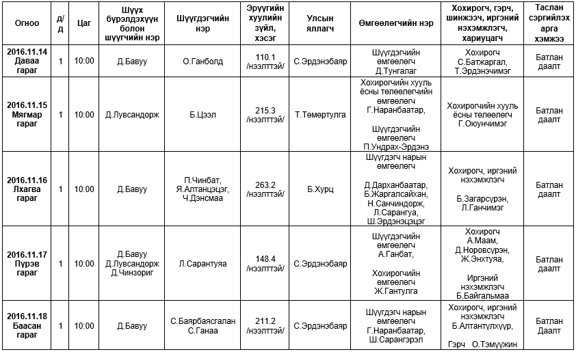 АНХАН ШАТНЫ ШҮҮХ ХУРАЛДААНААР ХЭЛЭЛЦҮҮЛЭХ ЭРҮҮГИЙН ХЭРГҮҮД (2016.11.14-11.18)