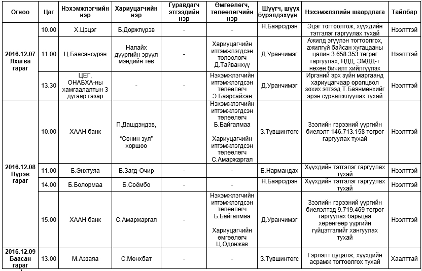 Шүүх хуралдаанаар хэлэлцэх иргэний хэргүүд (2016.12.05-12.09)