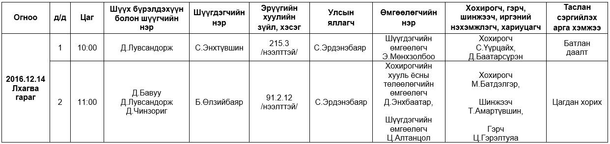 АНХАН ШАТНЫ ШҮҮХ ХУРАЛДААНААР ХЭЛЭЛЦҮҮЛЭХ ЭРҮҮГИЙН ХЭРГҮҮД (2016.12.12-12.16)