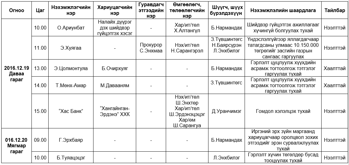 Шүүх хуралдаанаар хэлэлцэх иргэний хэргүүд (2016.12.19-12.23)