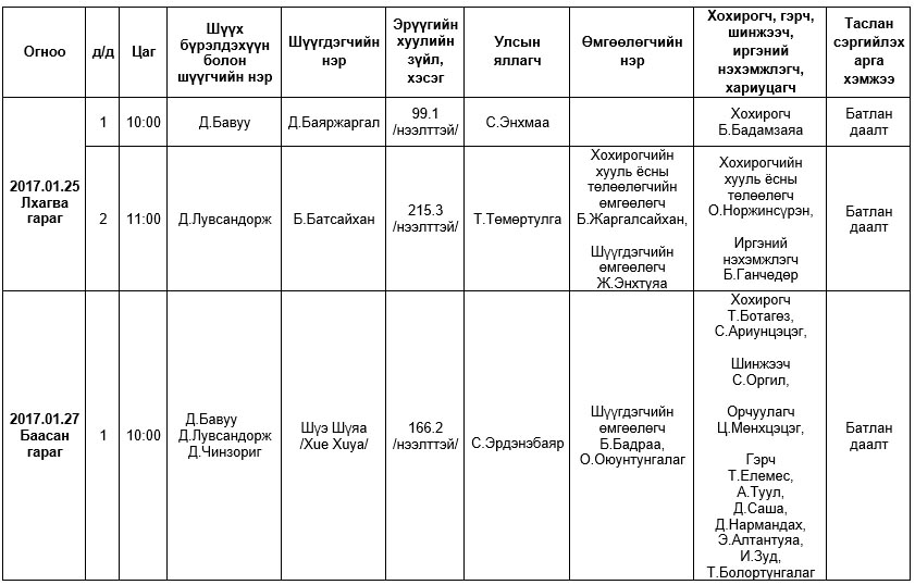 АНХАН ШАТНЫ ШҮҮХ ХУРАЛДААНААР ХЭЛЭЛЦҮҮЛЭХ ЭРҮҮГИЙН ХЭРГҮҮД (2017.01.23-01.27)