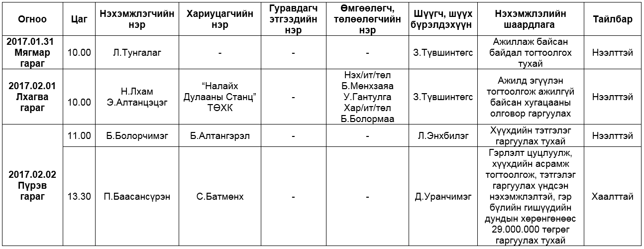 Шүүх хуралдаанаар хэлэлцэх иргэний хэргүүд (2017.01.30-02.03)