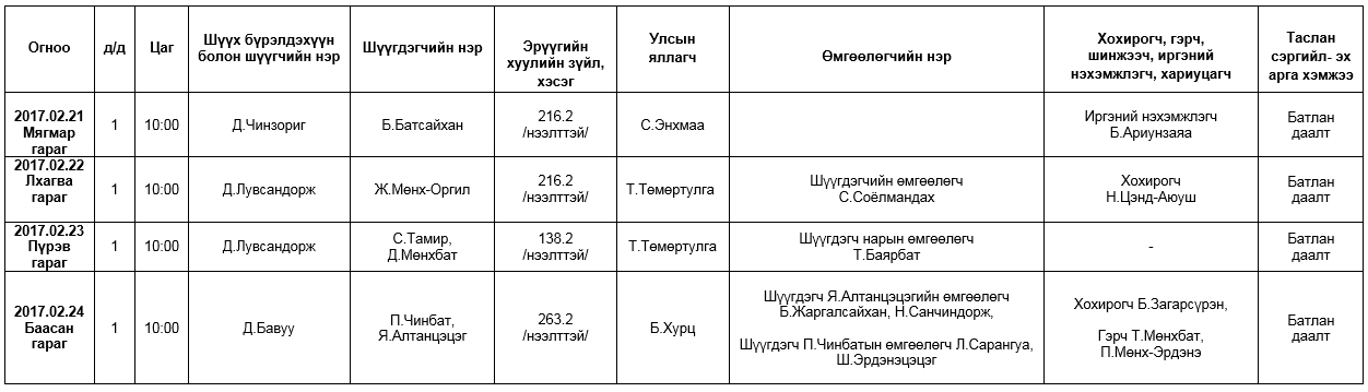 АНХАН ШАТНЫ ШҮҮХ ХУРАЛДААНААР ХЭЛЭЛЦҮҮЛЭХ ЭРҮҮГИЙН ХЭРГҮҮД (2017.02.20-02.24)