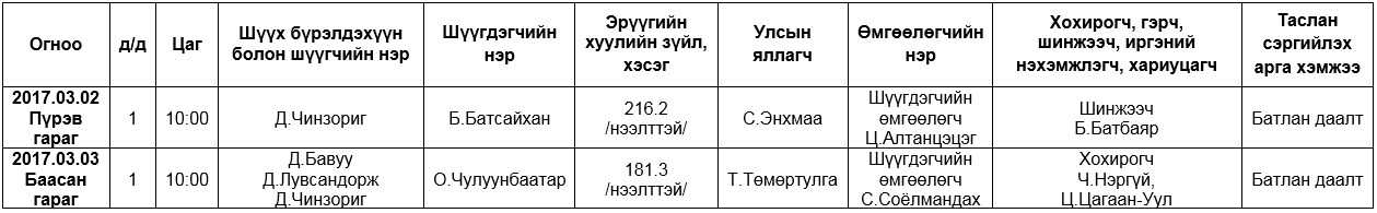 АНХАН ШАТНЫ ШҮҮХ ХУРАЛДААНААР ХЭЛЭЛЦҮҮЛЭХ ЭРҮҮГИЙН ХЭРГҮҮД (2017.02.27-03.03)