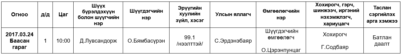 АНХАН ШАТНЫ ШҮҮХ ХУРАЛДААНААР ХЭЛЭЛЦҮҮЛЭХ ЭРҮҮГИЙН ХЭРГҮҮД (2017.03.20-03.24)
