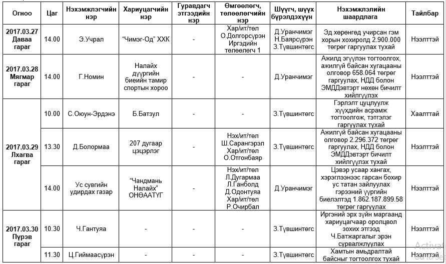 Шүүх хуралдаанаар хэлэлцэх иргэний хэргүүд (2017.03.27-03.31)