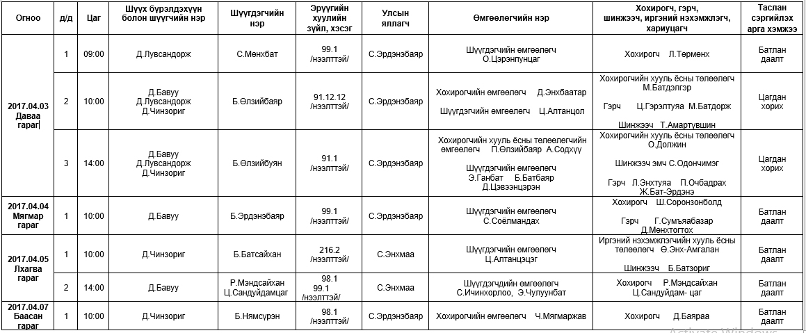 АНХАН ШАТНЫ ШҮҮХ ХУРАЛДААНААР ХЭЛЭЛЦҮҮЛЭХ ЭРҮҮГИЙН ХЭРГҮҮД (2017.04.03-04.07)
