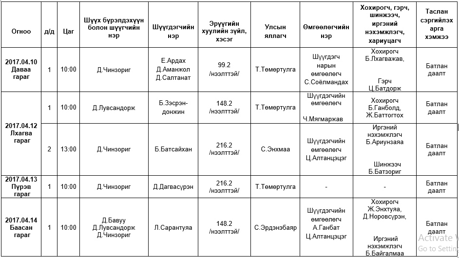 АНХАН ШАТНЫ ШҮҮХ ХУРАЛДААНААР ХЭЛЭЛЦҮҮЛЭХ ЭРҮҮГИЙН ХЭРГҮҮД (2017.04.10-04.14)