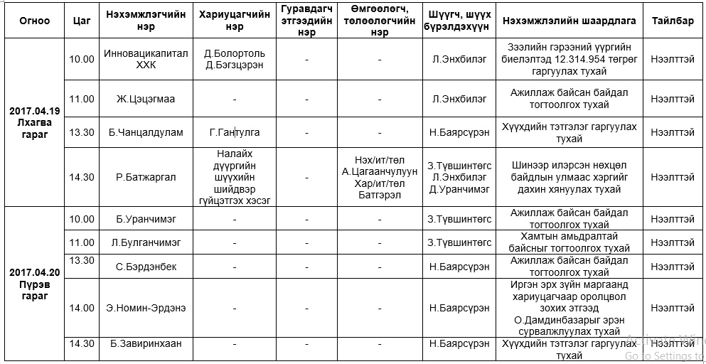 Шүүх хуралдаанаар хэлэлцэх иргэний хэргүүд (2017.04.17-04.21)