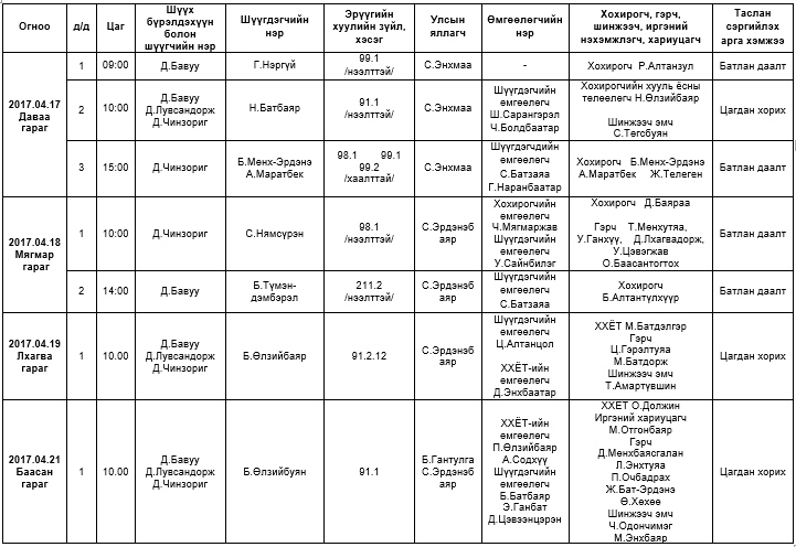АНХАН ШАТНЫ ШҮҮХ ХУРАЛДААНААР ХЭЛЭЛЦҮҮЛЭХ ЭРҮҮГИЙН ХЭРГҮҮД (2017.04.17-04.21)