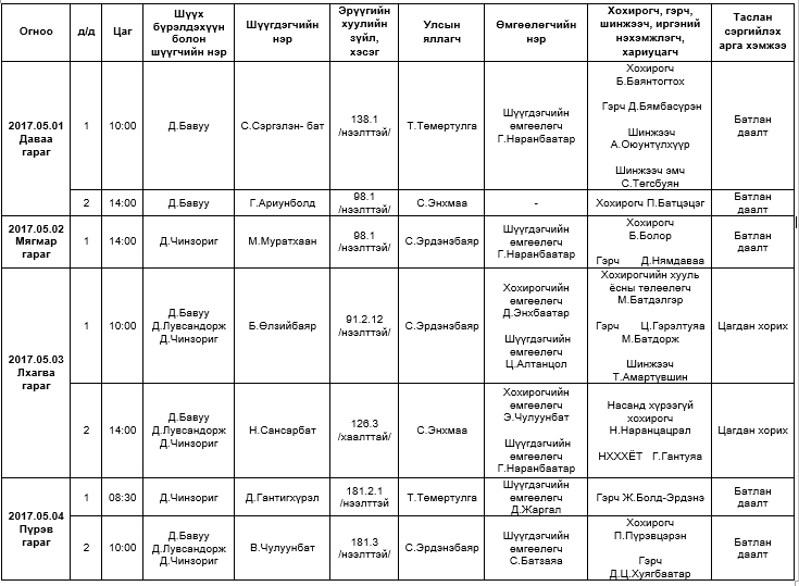 АНХАН ШАТНЫ ШҮҮХ ХУРАЛДААНААР ХЭЛЭЛЦҮҮЛЭХ ЭРҮҮГИЙН ХЭРГҮҮД (2017.05.01-05.05)