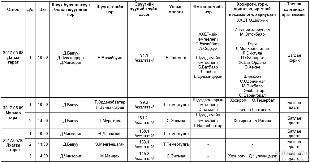 АНХАН ШАТНЫ ШҮҮХ ХУРАЛДААНААР ХЭЛЭЛЦҮҮЛЭХ ЭРҮҮГИЙН ХЭРГҮҮД (2017.05.08-05.12)