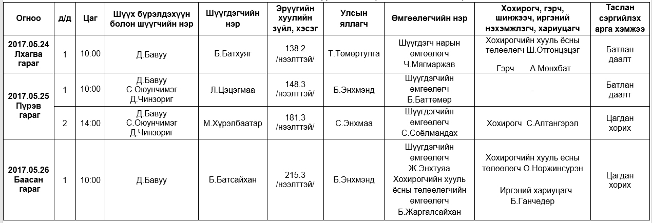 АНХАН ШАТНЫ ШҮҮХ ХУРАЛДААНААР ХЭЛЭЛЦҮҮЛЭХ ЭРҮҮГИЙН ХЭРГҮҮД (2017.05.22-05.26)