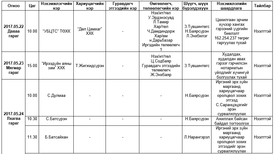 Шүүх хуралдаанаар хэлэлцэх иргэний хэргүүд (2017.05.22-05.26)