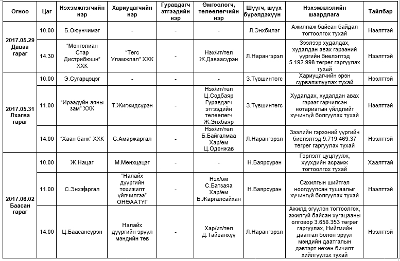 Шүүх хуралдаанаар хэлэлцэх иргэний хэргүүд (2017.05.29-06.02)