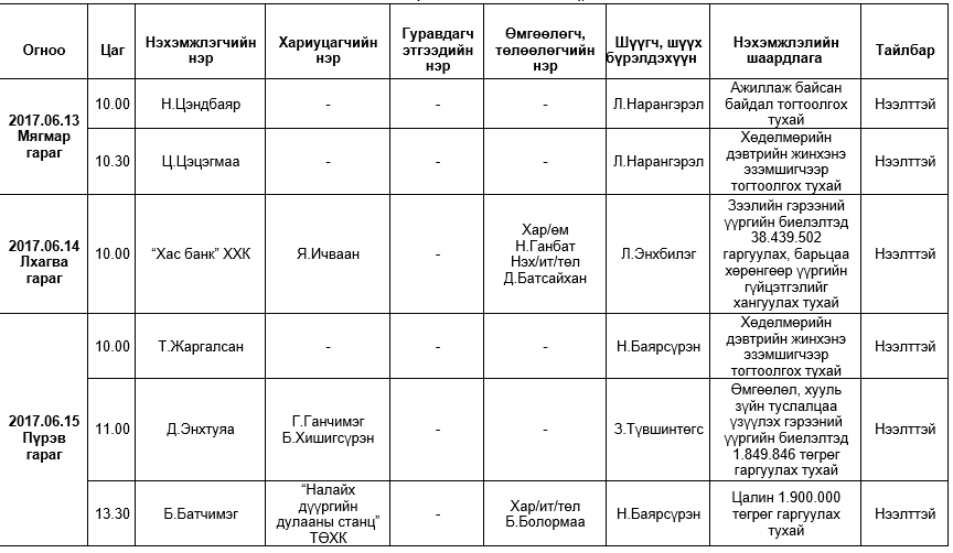 Шүүх хуралдаанаар хэлэлцэх иргэний хэргүүд (2017.06.12-06.16)