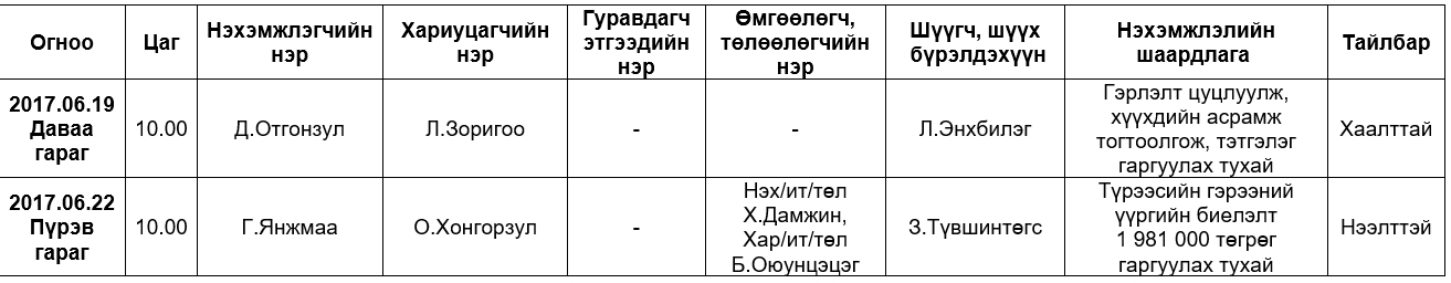 Шүүх хуралдаанаар хэлэлцэх иргэний хэргүүд (2017.06.19-06.23)