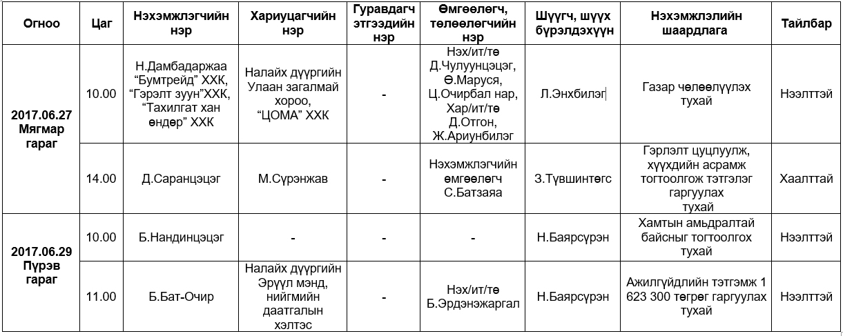 Шүүх хуралдаанаар хэлэлцэх иргэний хэргүүд (2017.06.26-06.30)