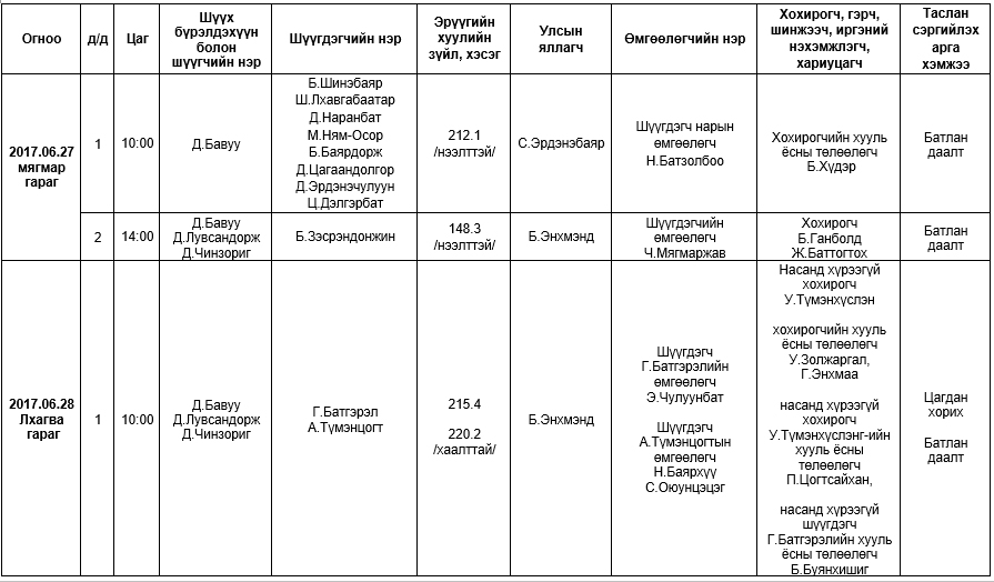 АНХАН ШАТНЫ ШҮҮХ ХУРАЛДААНААР ХЭЛЭЛЦҮҮЛЭХ ЭРҮҮГИЙН ХЭРГҮҮД (2017.06.26-06.30)