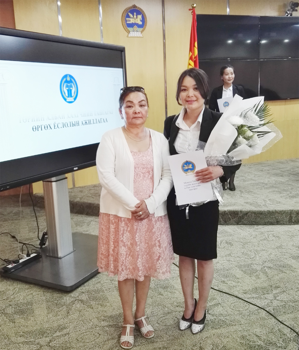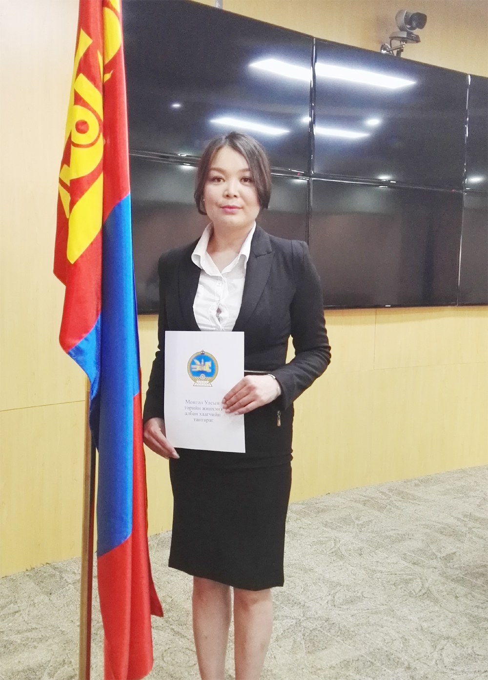 Үүний дараа шүүхийн захиргааны ажилтнууд Төрийн жинхэнэ албан хаагчийн тангаргийг дуудаж, Монгол Улсын төрийн сүлдэнд мэхийн ёслоод Төрийн далбаанаас адис авч, тангаргийн бичгээ гардлаа.