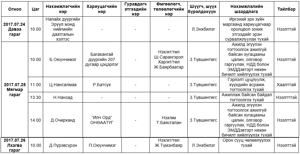 Шүүх хуралдаанаар хэлэлцэх иргэний хэргүүд (2017.07.24-07.28)
