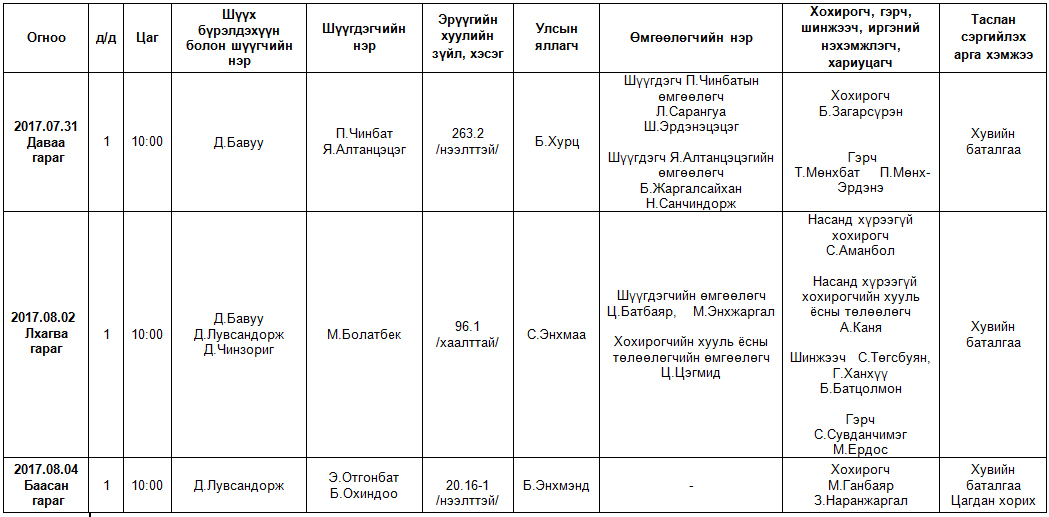 АНХАН ШАТНЫ ШҮҮХ ХУРАЛДААНААР ХЭЛЭЛЦҮҮЛЭХ ЭРҮҮГИЙН ХЭРГҮҮД (2017.07.31-08.04)