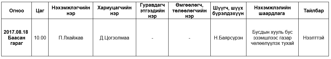 Шүүх хуралдаанаар хэлэлцэх иргэний хэргүүд (2017.08.14-08.18)