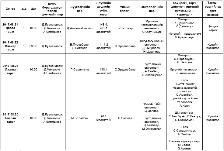 АНХАН ШАТНЫ ШҮҮХ ХУРАЛДААНААР ХЭЛЭЛЦҮҮЛЭХ ЭРҮҮГИЙН ХЭРГҮҮД (2017.08.21-08.25)