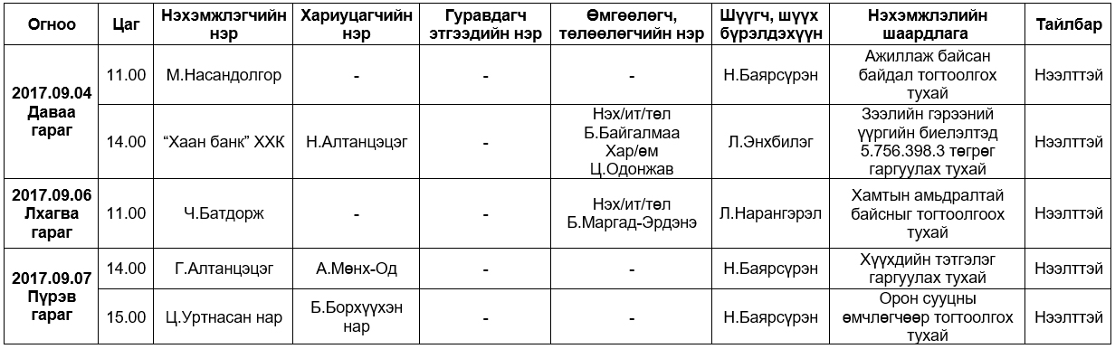 Шүүх хуралдаанаар хэлэлцэх иргэний хэргүүд (2017.09.04-09.08)