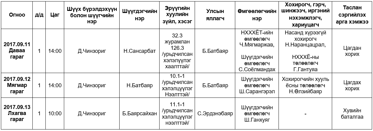 АНХАН ШАТНЫ ШҮҮХ ХУРАЛДААНААР ХЭЛЭЛЦҮҮЛЭХ ЭРҮҮГИЙН ХЭРГҮҮД (2017.09.11-09.15)