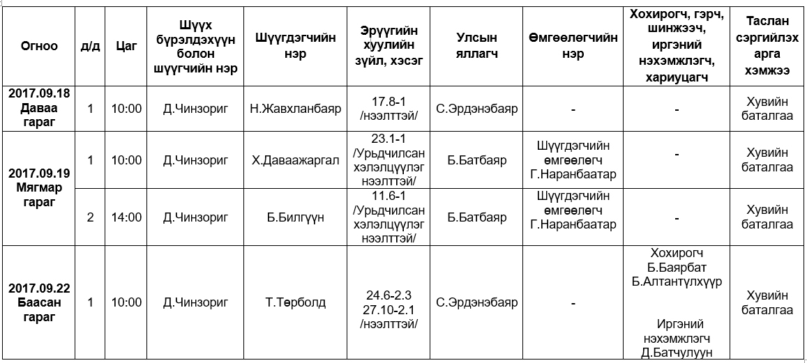 АНХАН ШАТНЫ ШҮҮХ ХУРАЛДААНААР ХЭЛЭЛЦҮҮЛЭХ ЭРҮҮГИЙН ХЭРГҮҮД (2017.09.18-09.22)