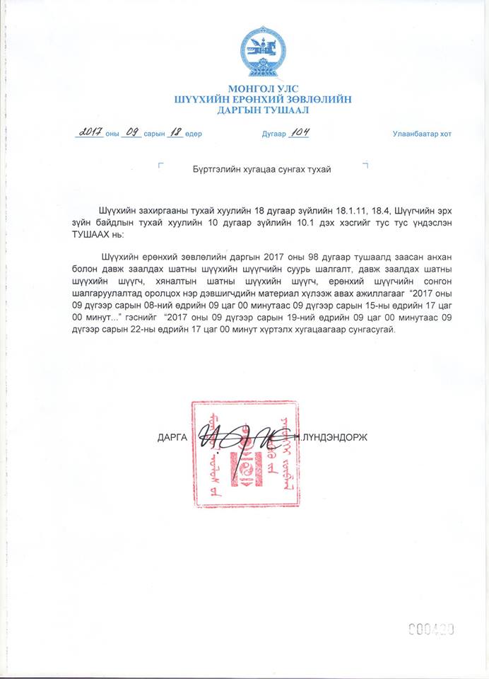 Шүүхийн ерөнхий зөвлөлийн даргын 2017 оны 85, 86 дугаар тушаалаар зарласан анхан болон давж заалдах шатны шүүхийн шүүгчийн суурь шалгалт, давж заалдах шатны шүүхийн шүүгч, хяналтын шатны шүүхийн шүүгч, ерөнхий шүүгчийн сонгон шалгаруулалтад оролцох нэр дэвшигчдийн материалыг 2017 оны 09 дүгээр сарын 19-ний өдрийн 09 цаг 00 минутаас 09 дүгээр сарын 22-ны өдрийн 17 цаг 00 минут цаг хүртэл бүртгэлийг дахин явуулахаар хугацааг сунгалаа.