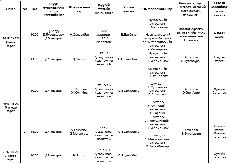 АНХАН ШАТНЫ ШҮҮХ ХУРАЛДААНААР ХЭЛЭЛЦҮҮЛЭХ ЭРҮҮГИЙН ХЭРГҮҮД (2017.09.25-09.29)
