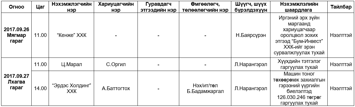 Шүүх хуралдаанаар хэлэлцэх иргэний хэргүүд (2017.09.25-09.29)