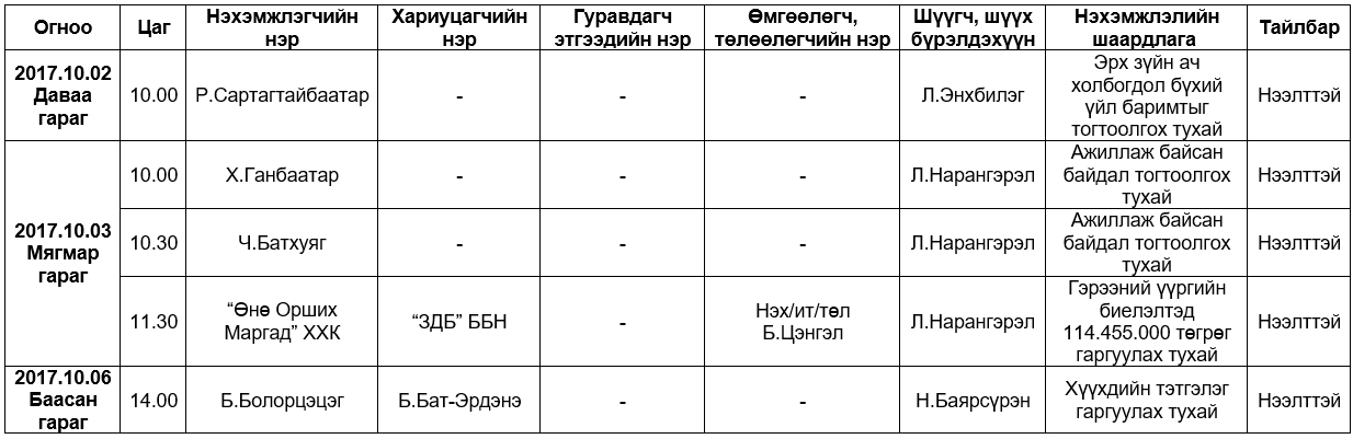 Шүүх хуралдаанаар хэлэлцэх иргэний хэргүүд (2017.10.02-10.06)