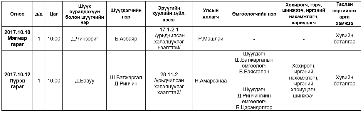 АНХАН ШАТНЫ ШҮҮХ ХУРАЛДААНААР ХЭЛЭЛЦҮҮЛЭХ ЭРҮҮГИЙН ХЭРГҮҮД (2017.10.09-10.13)