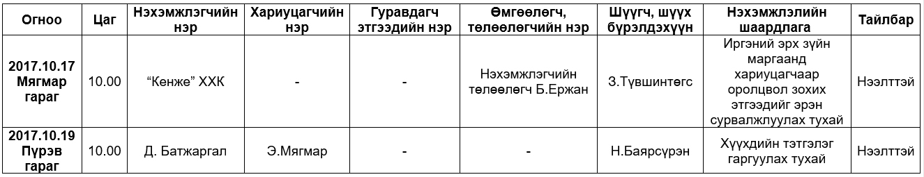 Шүүх хуралдаанаар хэлэлцэх иргэний хэргүүд (2017.10.16-10.20)