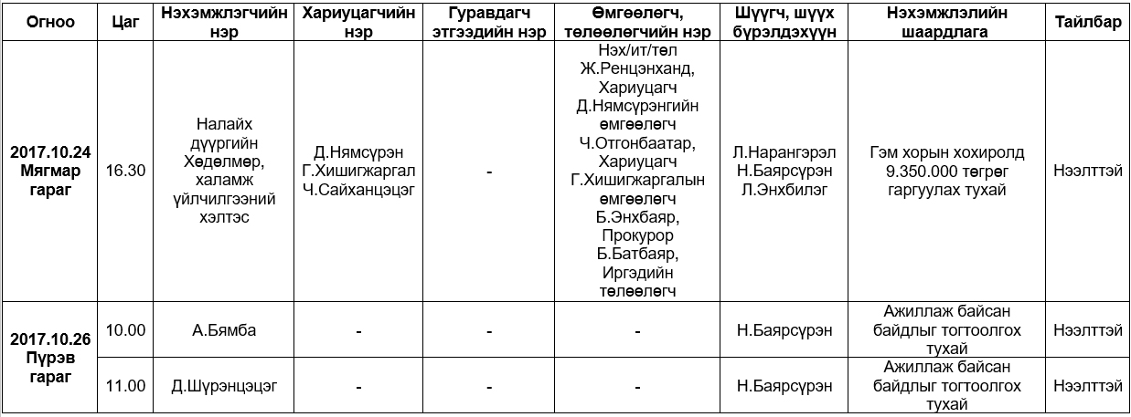 Шүүх хуралдаанаар хэлэлцэх иргэний хэргүүд (2017.10.23-10.27)